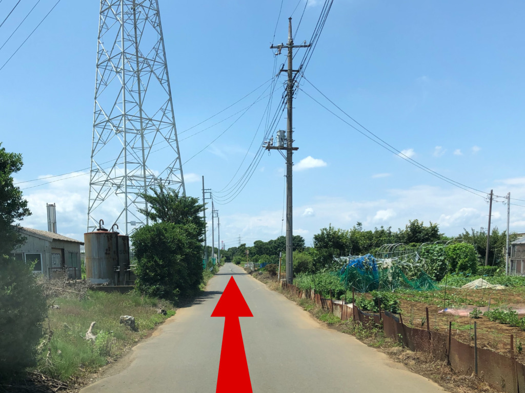 ④右折すると左手に送電塔が見えてくるので直進します。